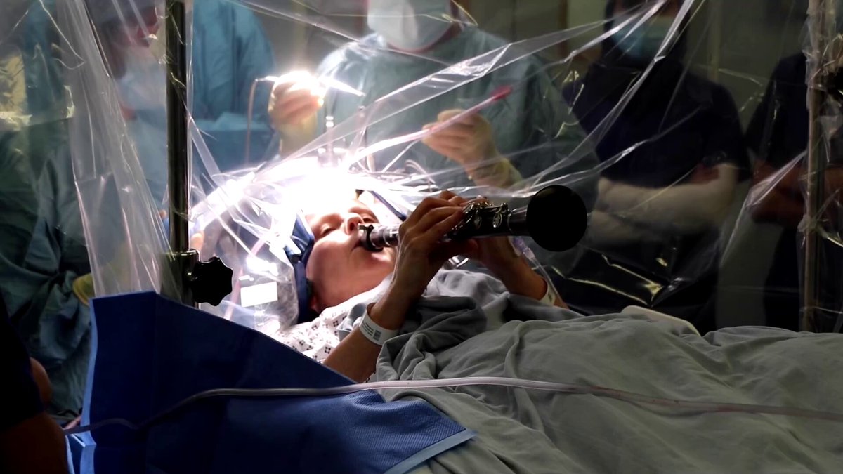 Denise stayed awake and played the clarinet so surgeons could see how her finger movements changed as an electrical current was delivered to her brain