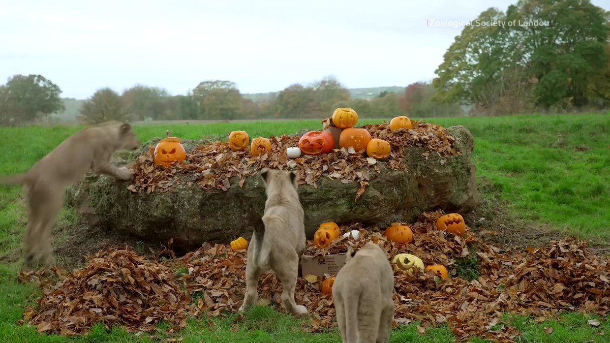 Whipsnade Zoo's one‑horned rhino Hugo explored a pumpkin patch while black lemurs Camilla and Kagi climbed through marigold and Day of the Dead decor to forage ... Show more